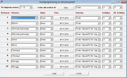 hver øvelse velges distanse, kjønn og dato. Hvis